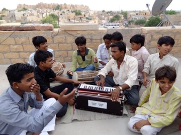 Anwar Khan teaching vocal, Gevar Khan kamaicha, Latif Khan dholak, Jaisalmer August 2011