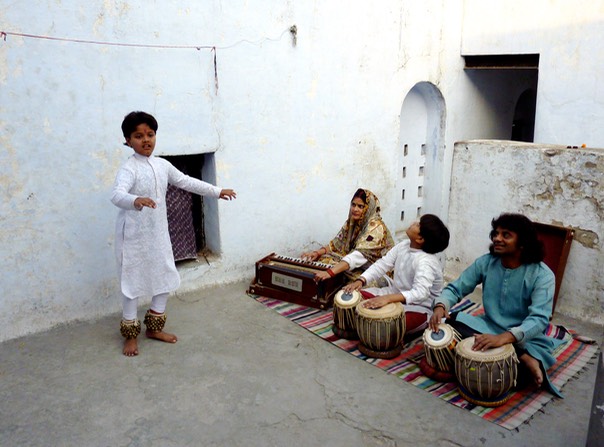 Ravi Shankar Mishra, a superb Kathak dancer and tabla player of Kabir Chaura, Varanasi, is shown here with his two sons 10-year-old Abijhit, a dancer, and 12-year-old Aditya, December 2010. These boys made enormous progress during the three years that I worked with them. Ravi Shankar represents an illustrious lineage, having learnt tabla from his father Panchu Maharaj and dance from Alekananda Devi, the elder didter of Sitara Devi. Mata Prasad Mishra is his cousin.
