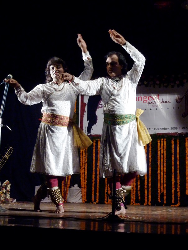Ravi Shankar Mishra (left) with Mata Prasad Mishra (right) at Nagari Natak Manadali, Varanasi, 2010