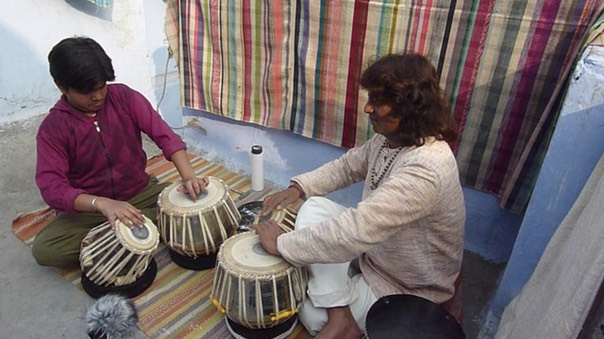 Giving Aditya a tabla lesson, Kabir Chaura, Varanasi January 2011