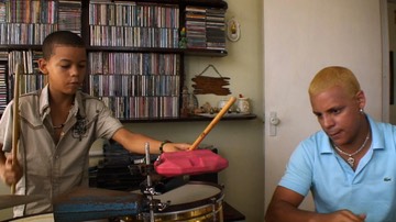 Alex Suárez is the son of percussionist René Suárez and flautist Vivian Jiménez, both noted salsa musicians. He studies at the Guillermo Tomás music school in Guanabacoa, where he is also the drummer for Los Van Vancitos, a group of teenage music students who play the repertoire of top Cuban salsa group Los Van Van under the tutelage of one of the group’s founding members, Gerardo Miró Rivera.