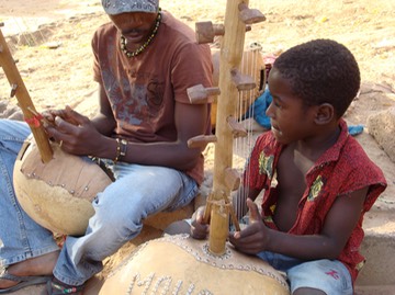 Daniel and his older brother Vieux Dambele, playing the orozo (calabash harp)
