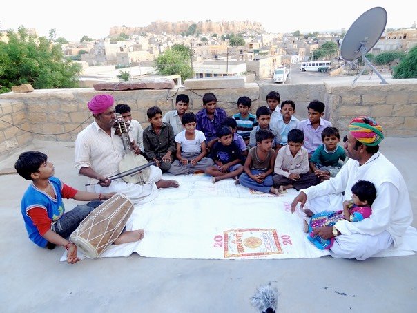 Anwar Khan teaching vocal, Gevar Khan kamaicha, Latif Khan dholak, Jaisalmer August 2011